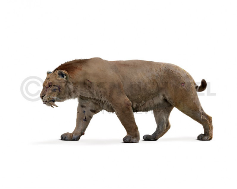Smilodon was the largest saber-tooth cat (popularly known as the sabre tooth tiger). It was a fierce predator about 1.5- 2,1 metres long and 1.2 metres tall. It weighed 200-400 kg. It had relatively short legs and a short, bobbed tail a bit like that of a modern-day Bobcat which is why it is called that because of its bob-like tail. Its front legs were especially powerful and its body was adapted for springing onto prey, but it was not a very fast runner and could not be adapted for chasing after fast running prey like deer. It could hunt some slower animals such as Macrauchenia (Macrauchenia patagonica), Toxodon (Toxodon), some subspecies of Mammoths, Ground Sloths (Megatherium), early humans, etc).