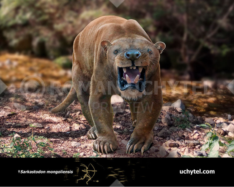 Sarkastodon is an extinct genus within the family Oxyaenidae that lived during the upper Eocene, approximately 39.9 million years ago. It was a large, carnivorous animal that lived in what is today Mongolia. It is estimated to have been about 500 kilograms in weight, somewhat bigger than any living bear in average body size and near the maximum possible size for terrestrial carnivorous mammals. It is seen today in animals such as the Kodiak bear, which reaches that size only in captivity. Sarkastodon is assumed to have had a bear-like appearance, though only skulls and jawbones are known. Sarkastodon, like creodonts in general, was probably a hypercarnivore that preyed on large mammals in its range during the Late Eocene, such as brontotheres, chalicotheres, and rhinoceroses.